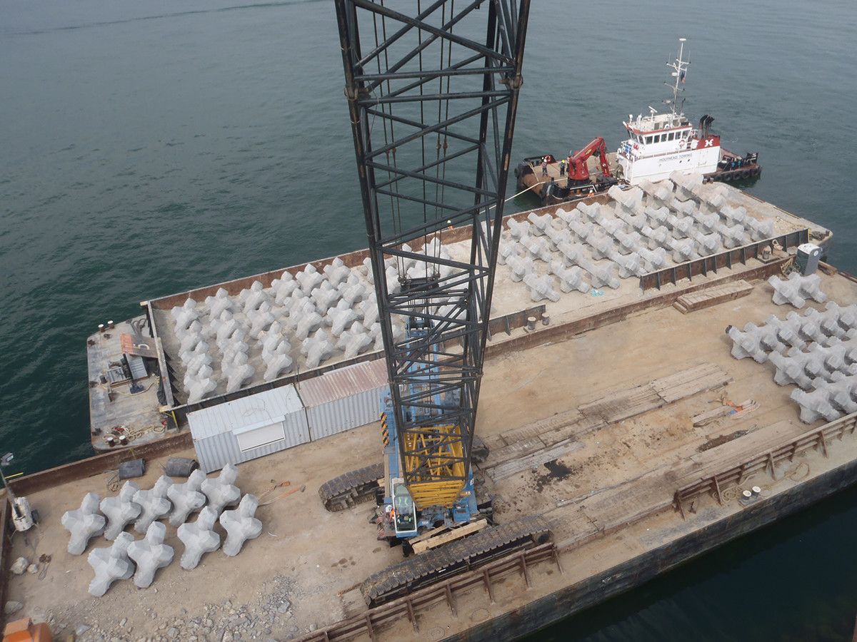 Pendant l’exécution des travaux, une forte tempête a considérablement influencé les travaux de l’ouvrage mais à seulement causé des retards mineurs pour la pose des blocs ACCROPODE™ II et peu de dommages observés sur les zones protégées.